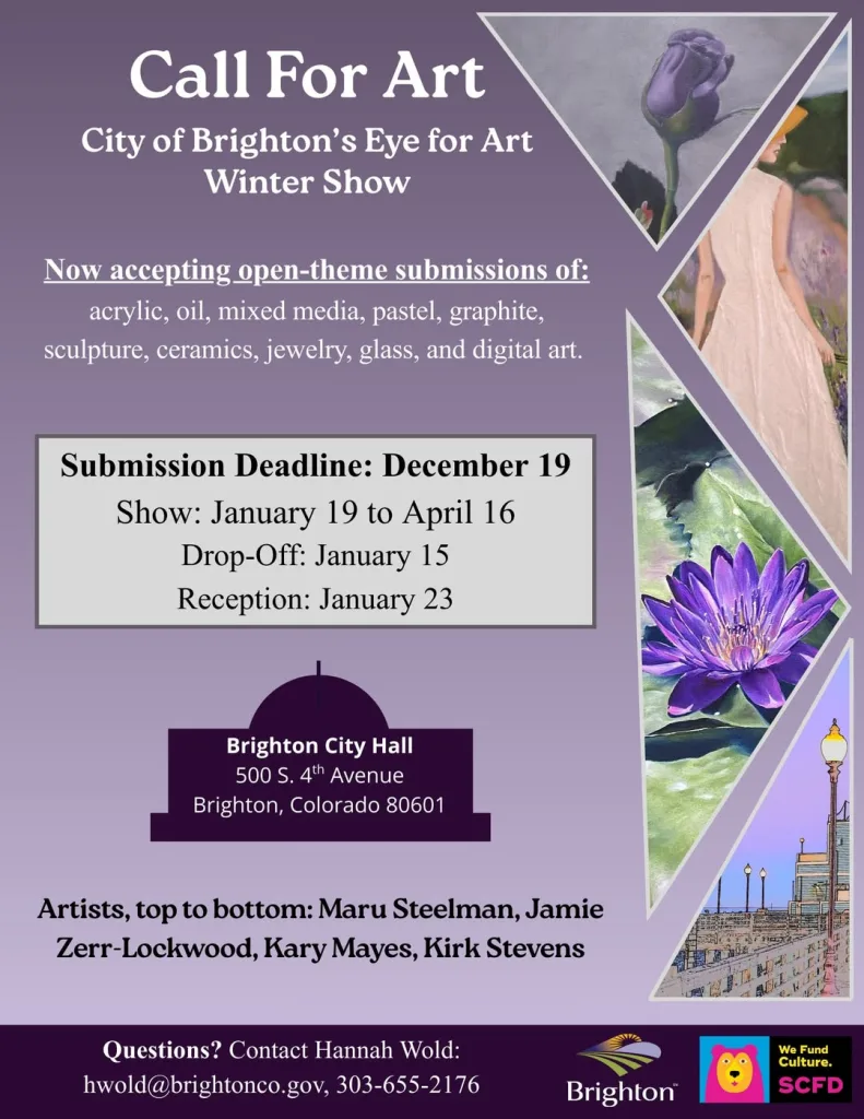 Calling all Colorado artists: the City of Brighton’s Eye for Art Winter Showcase is open for submissions! We’re accepting open-theme submissions in a variety of mediums, including acrylic, oil, watercolor, photography, mixed media, graphite, ceramics, jewelry, and more.